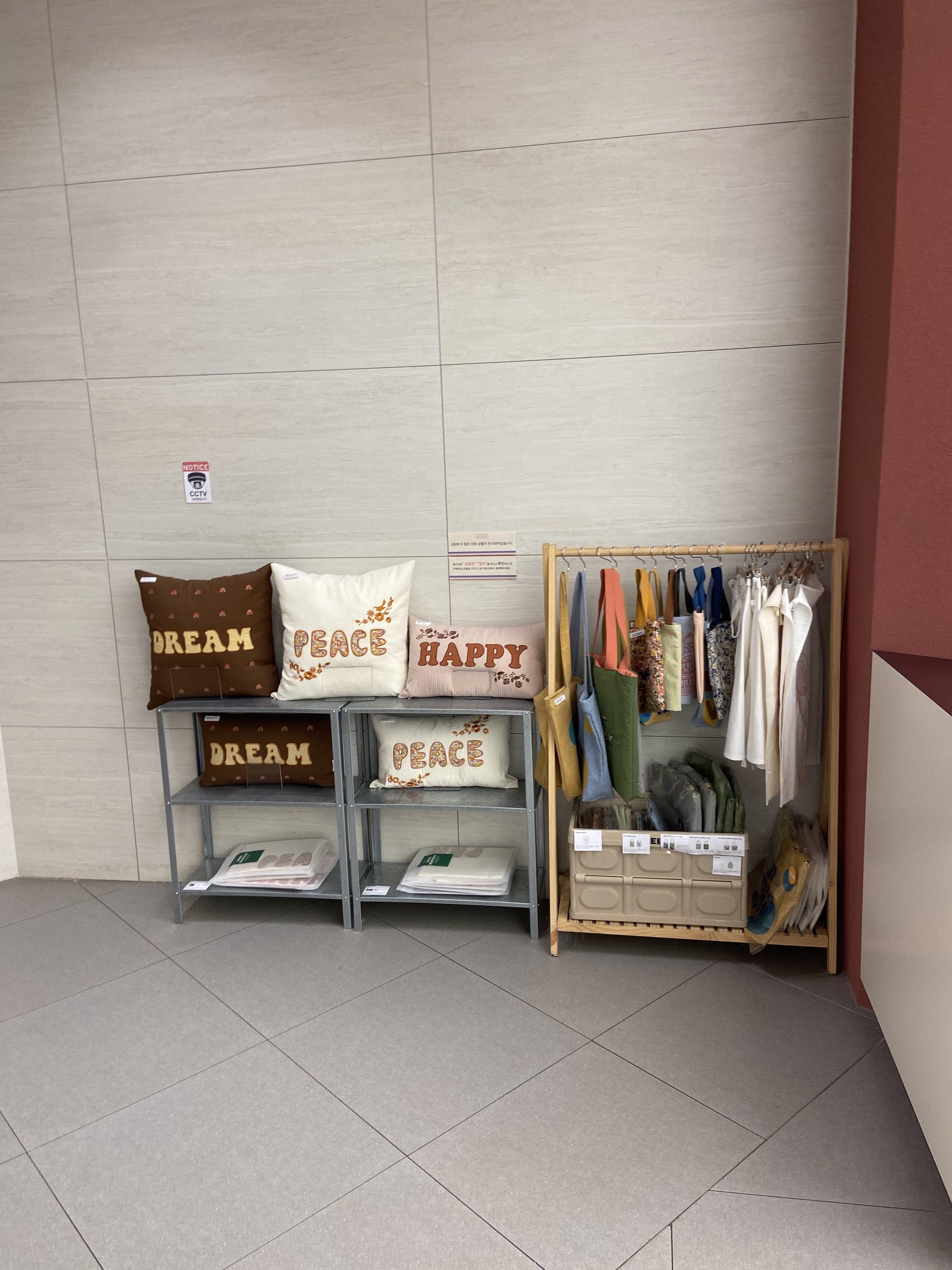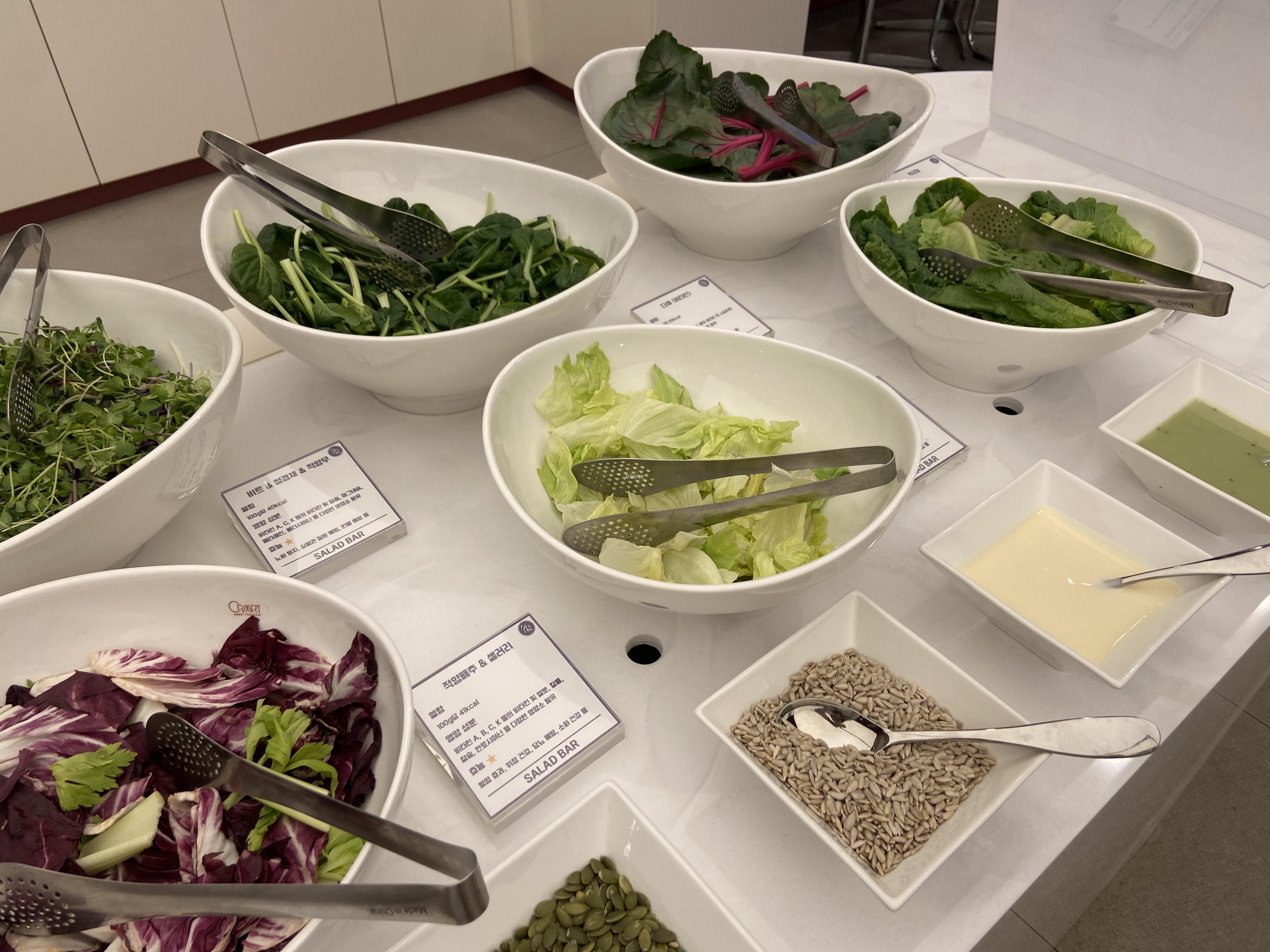 1층에 도착하자마자 탁 트인 넓은 공간과 예쁜 엠디 상품, 그리고 정중앙에 위치한 샐러드바가 보였어요.