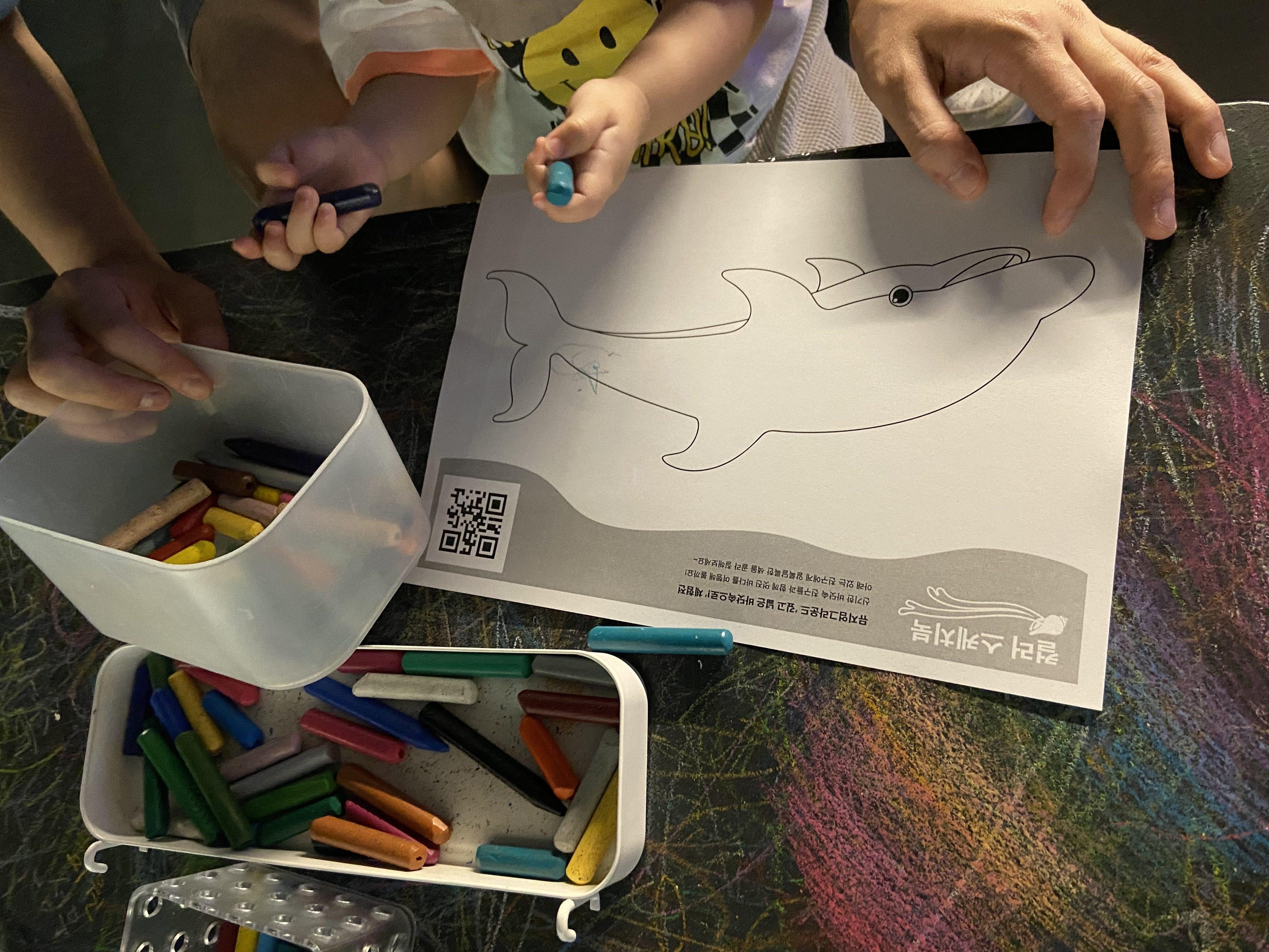 이 공간의 포인트는, 물고기가 그려진 종이 위에 예쁘게 색칠해 기기에 올려두면 우리가 그린 물고기가 커다란 디스플레이 화면에 비춰진다는 것! 아기는 물론 어른인 제가 봐도 너무 재밌고 신기하더라구요.