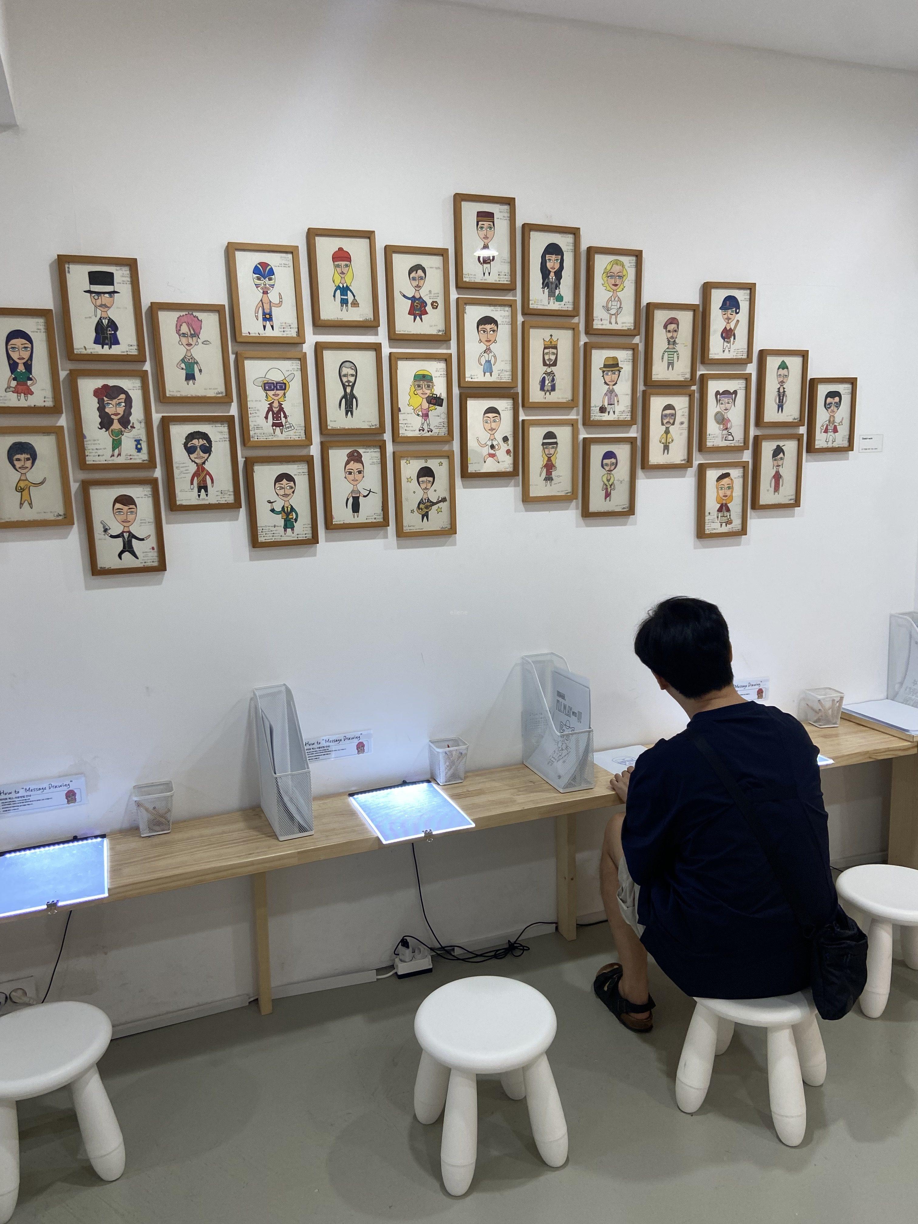 다음 공간 역시 그림을 그리는 곳이었는데요. 책상에 부착되어있는 패드 위에 밑그림이 그려진 종이를 올리고, 또다시 투명 용지를 덮어 그 위에 색칠을 하면 나름 퀄리티 높은 그림이 완성됩니다. 옆에 있는 다양한 모양의 도장을 종이 위에 찍을 수도 있어요.