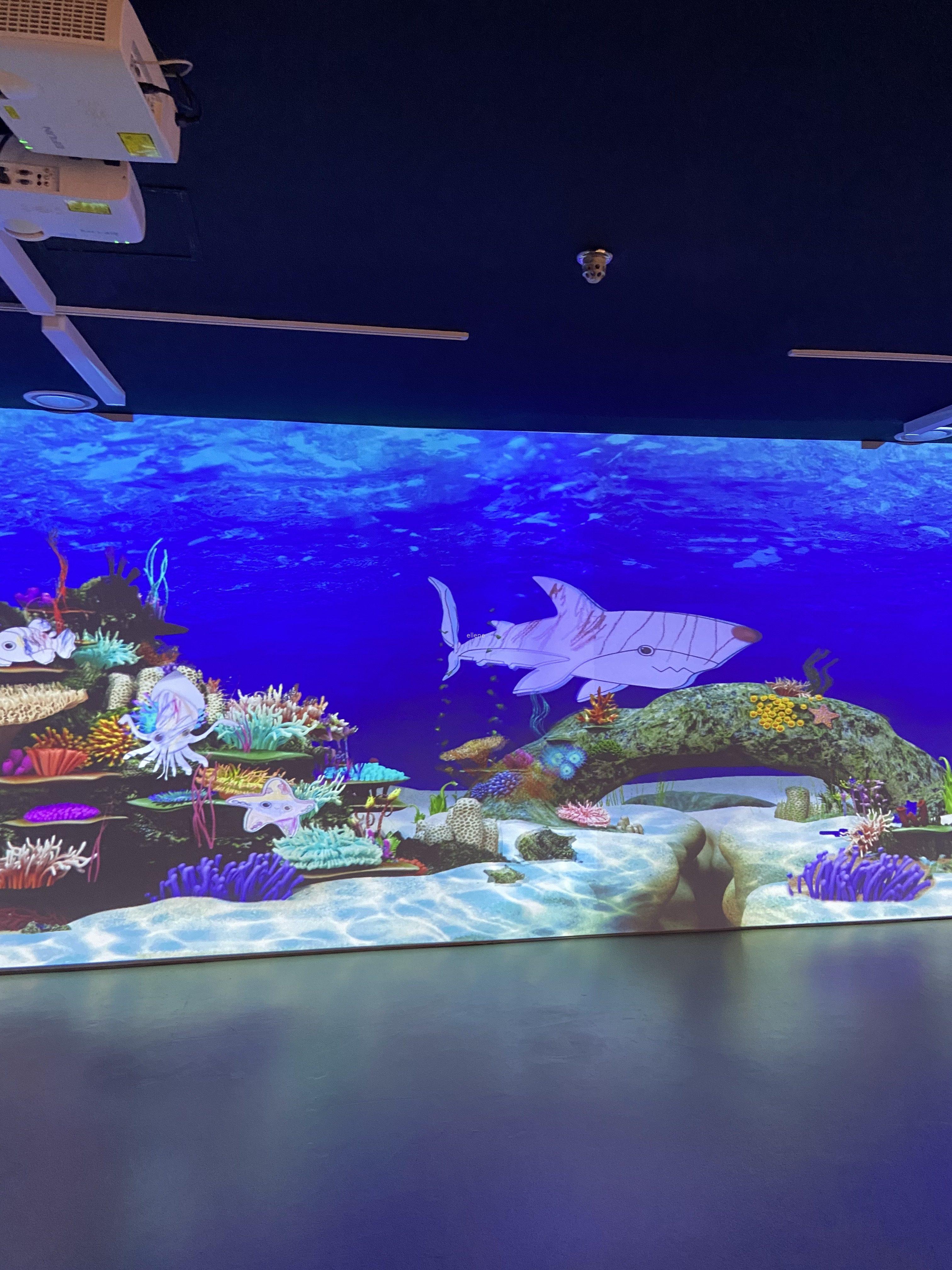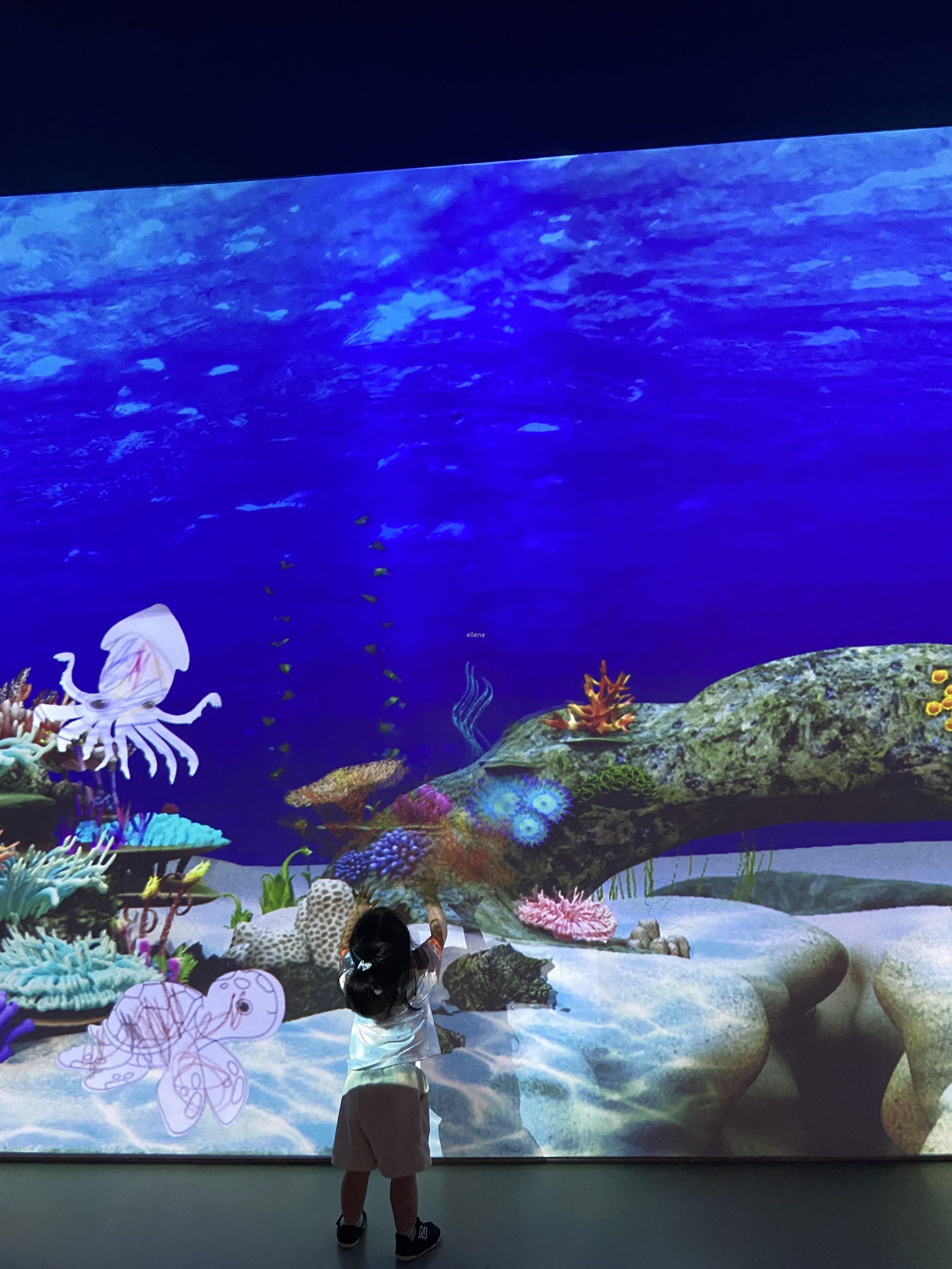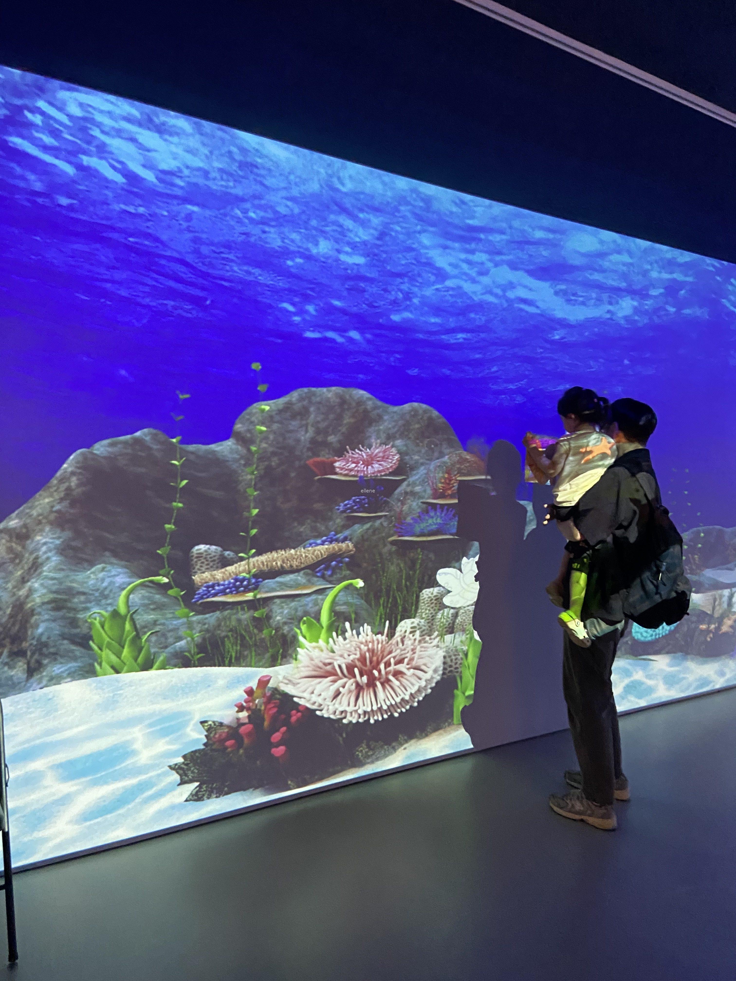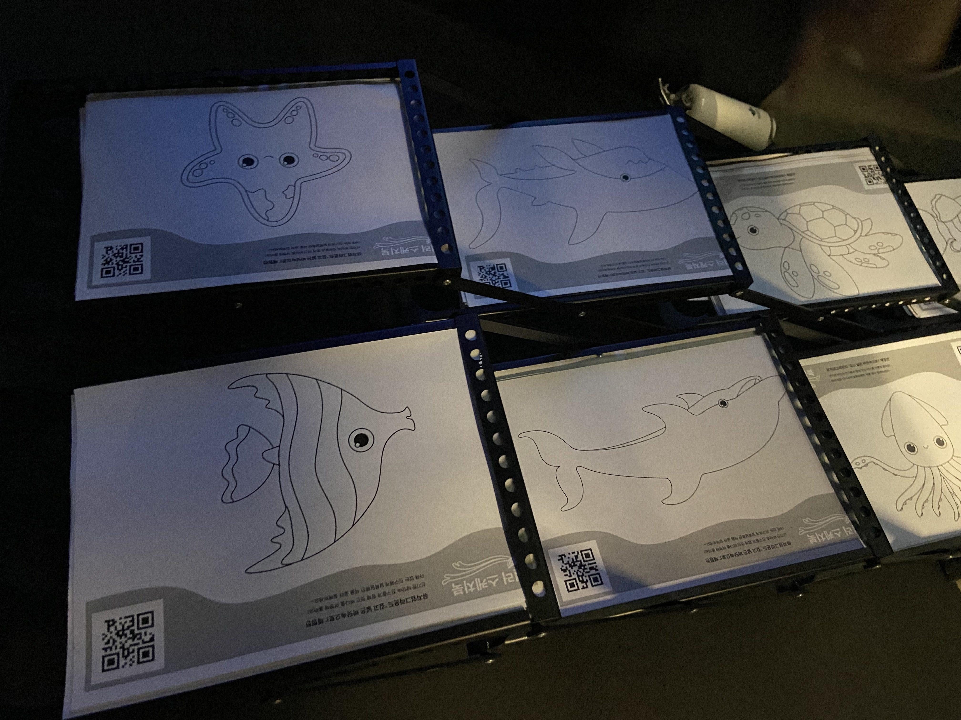 이 공간의 포인트는, 물고기가 그려진 종이 위에 예쁘게 색칠해 기기에 올려두면 우리가 그린 물고기가 커다란 디스플레이 화면에 비춰진다는 것! 아기는 물론 어른인 제가 봐도 너무 재밌고 신기하더라구요.