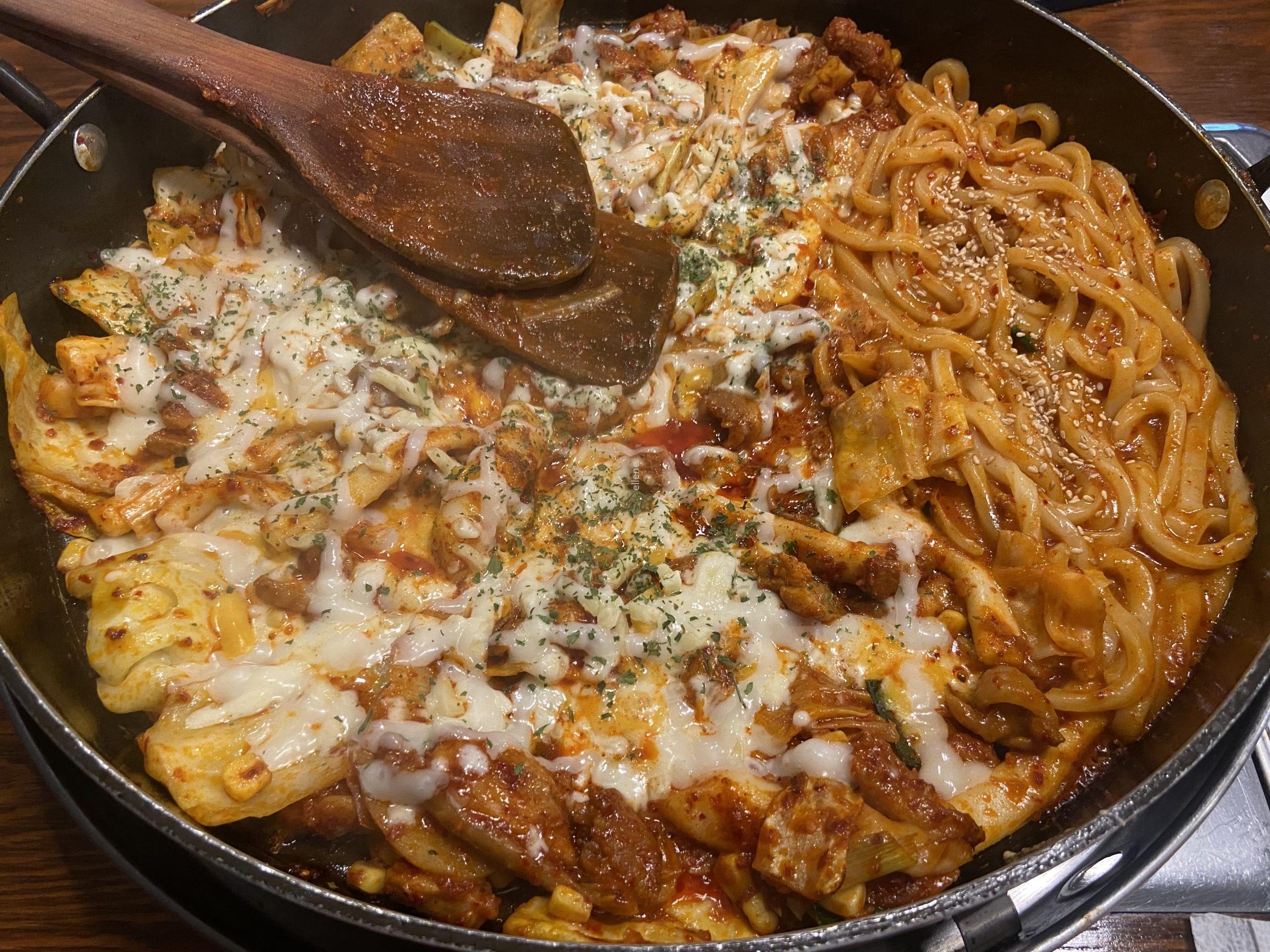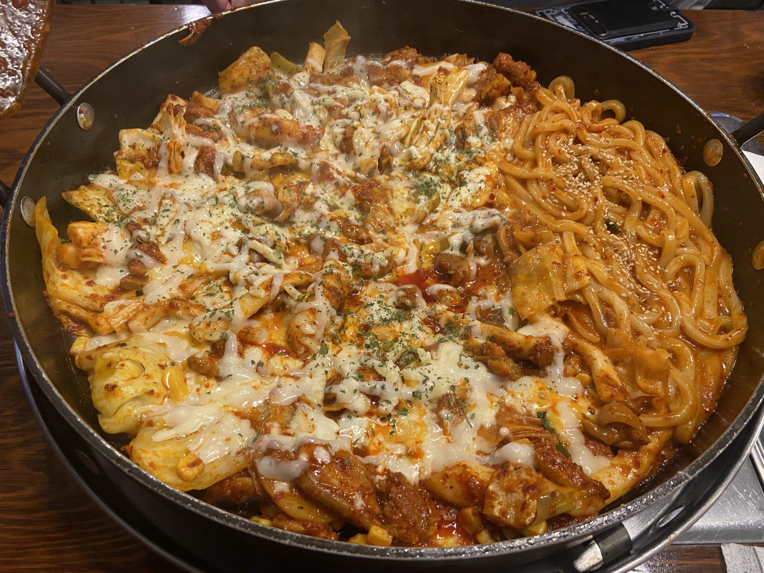 조금 기다리자 닭갈비가 제공됐다. 예전에는 테이블에서 직접 조리해줬는데, 이제는 주방에서 조리한 음식을 테이블로 가져다주시는 것 같다. 우동사리를 추가해서인지 음식이 더 풍성하고 많아보인다.