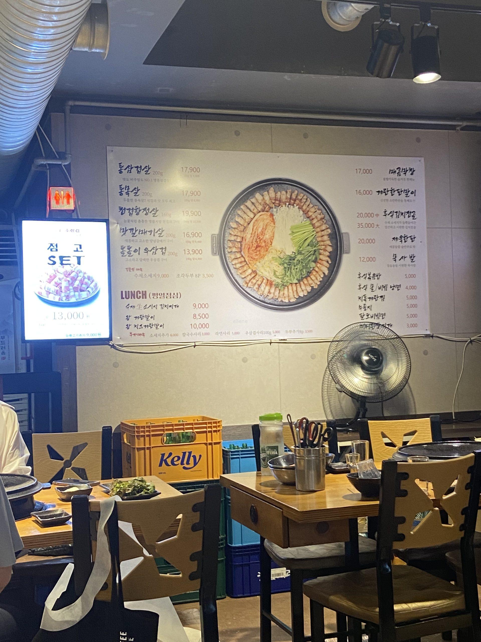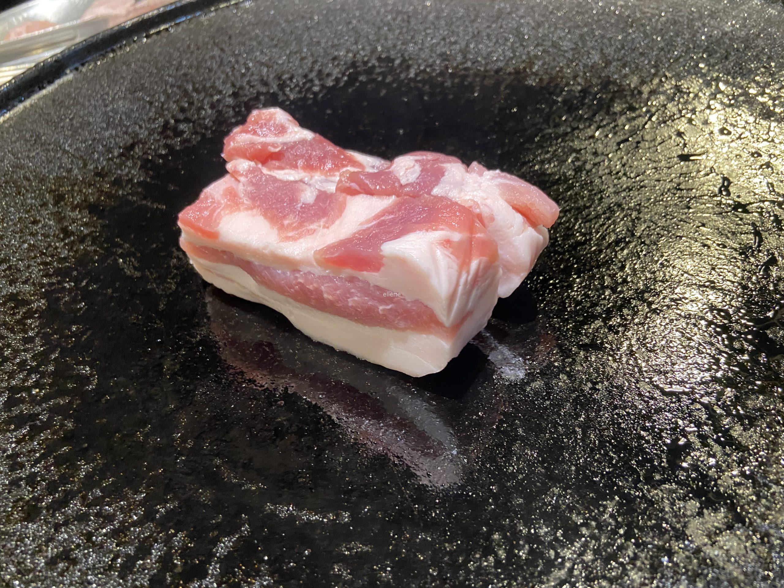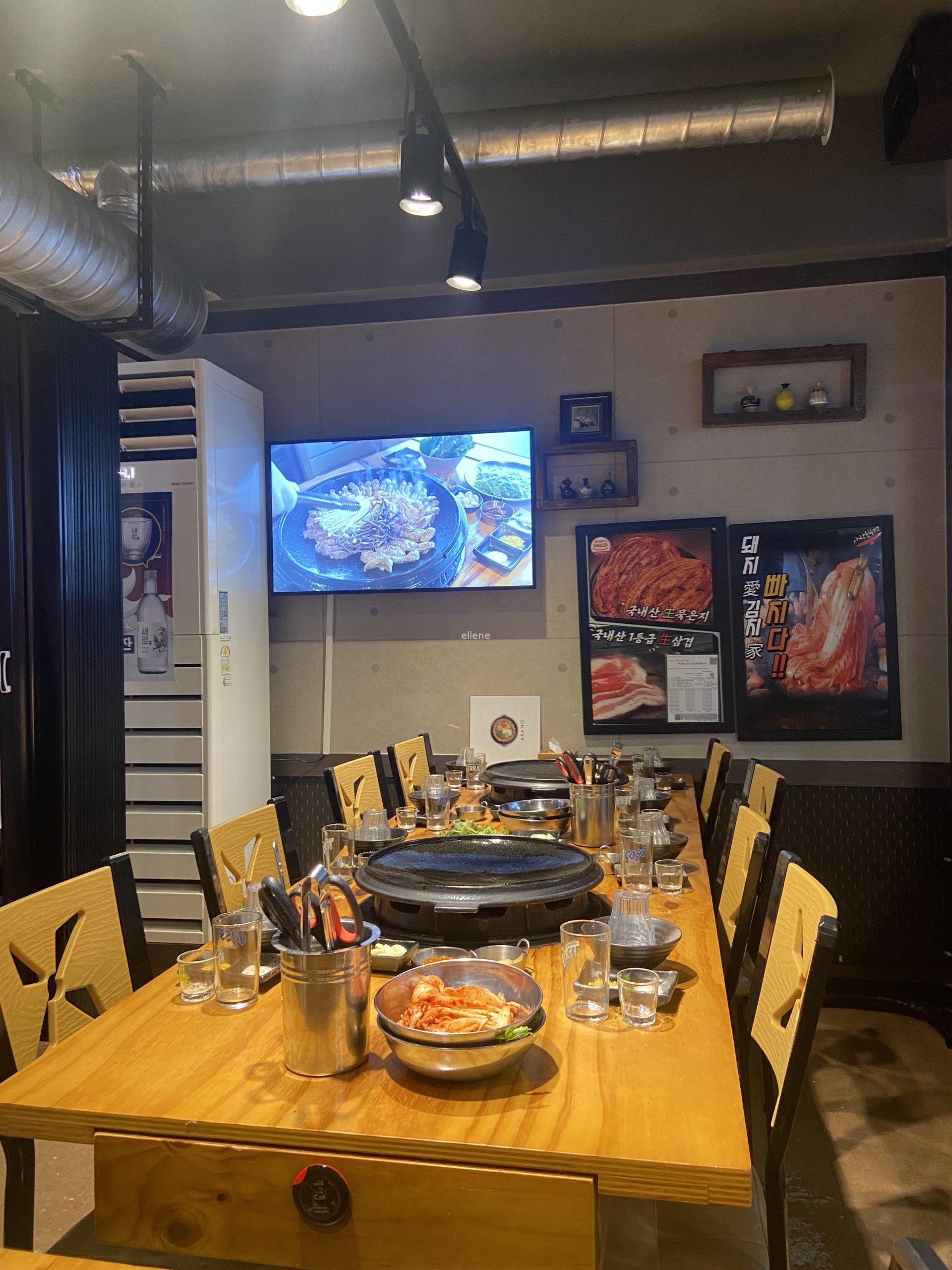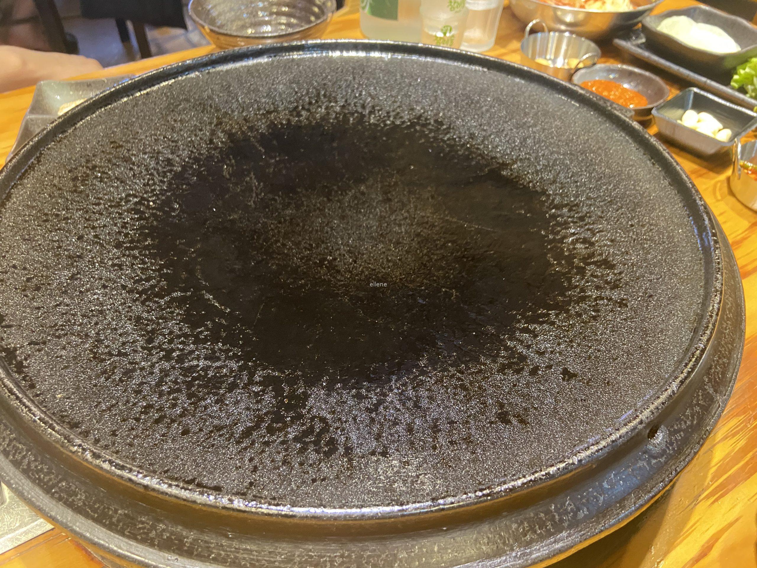 사실 이렇게 솥뚜껑에 구워먹는 고기집을 찾는 건 생각보다 쉽지 않다. 요즘엔 가게 이름에만 솥뚜껑을 붙여놓고 작거나 변형한 솥뚜껑을 갖다 놓는 곳도 많다. 그래서 이 솥뚜껑을 보자마자 기대감이 높아지면서 고기를 빨리 맛보고 싶어졌다.