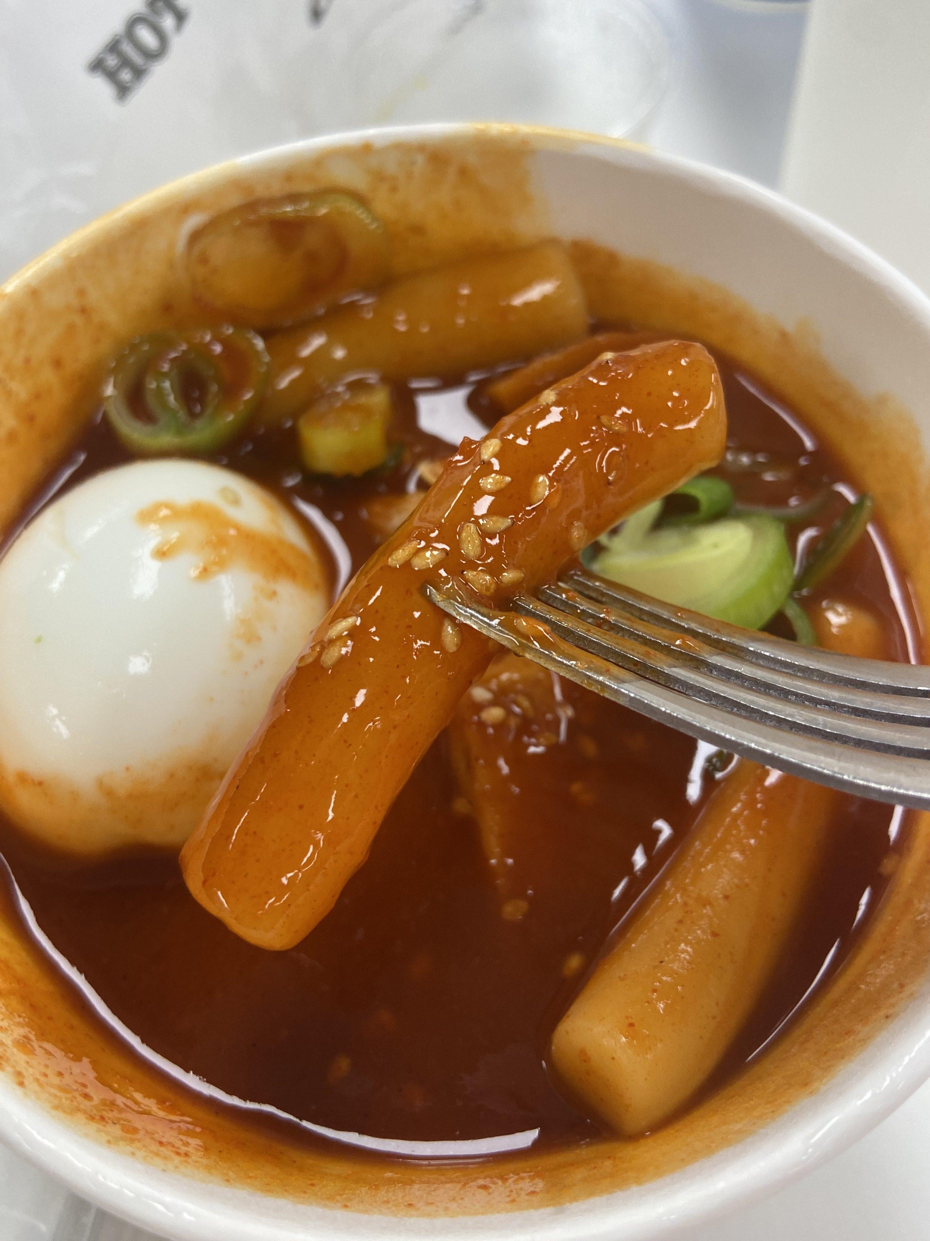 떡볶이는 저 종이로 만든 그릇 안에 담겨있다. 그릇이 컵반 정도 크기라, 딱 1인분 정도 되는 양일 것 같다.