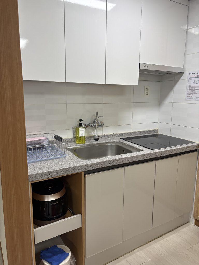 작은 부엌도 있다. 이 곳에 식기, 냄비, 조리도구 등이 다 있기 때문에 세척해서 편히 사용할 수 있다.