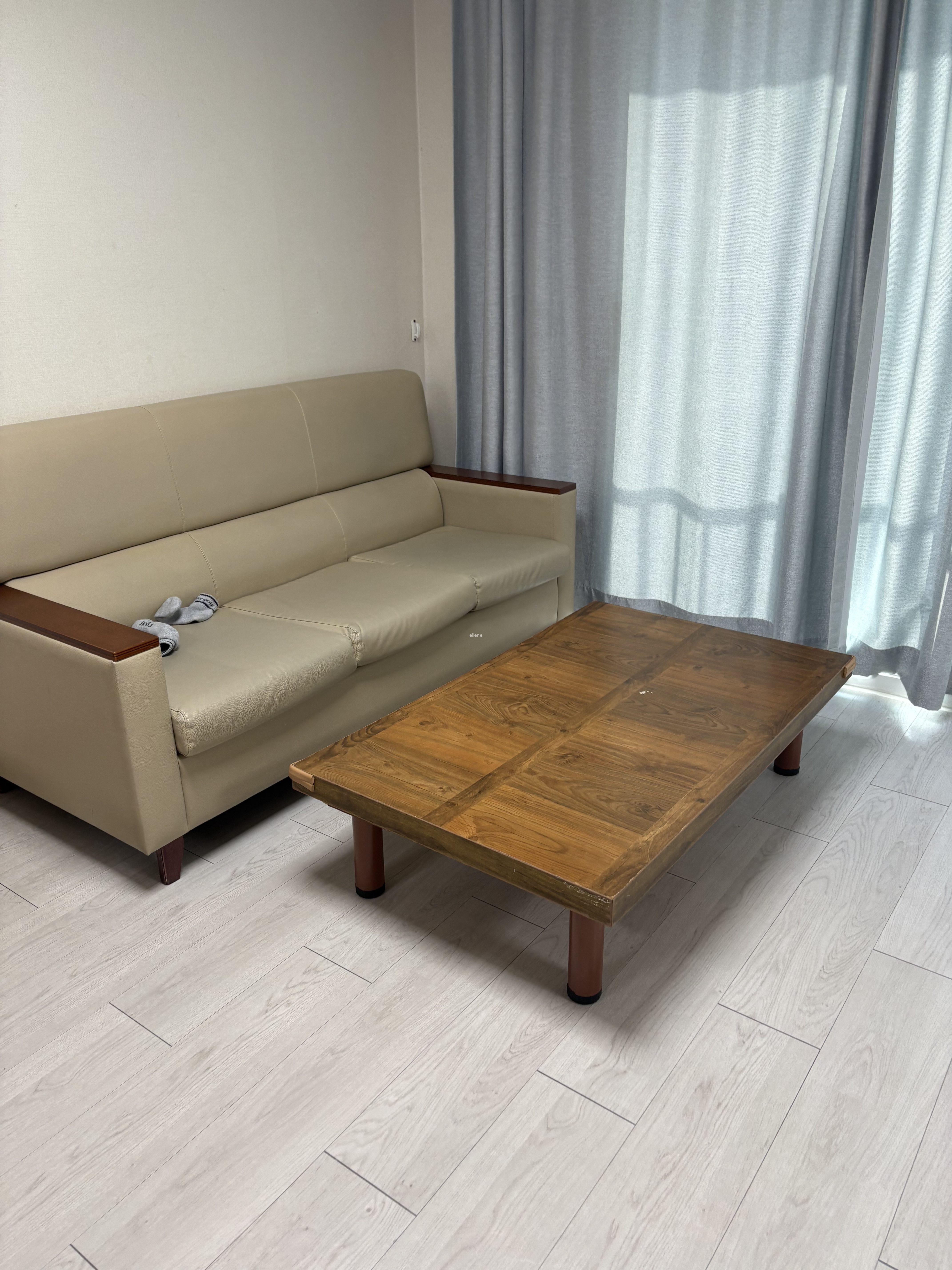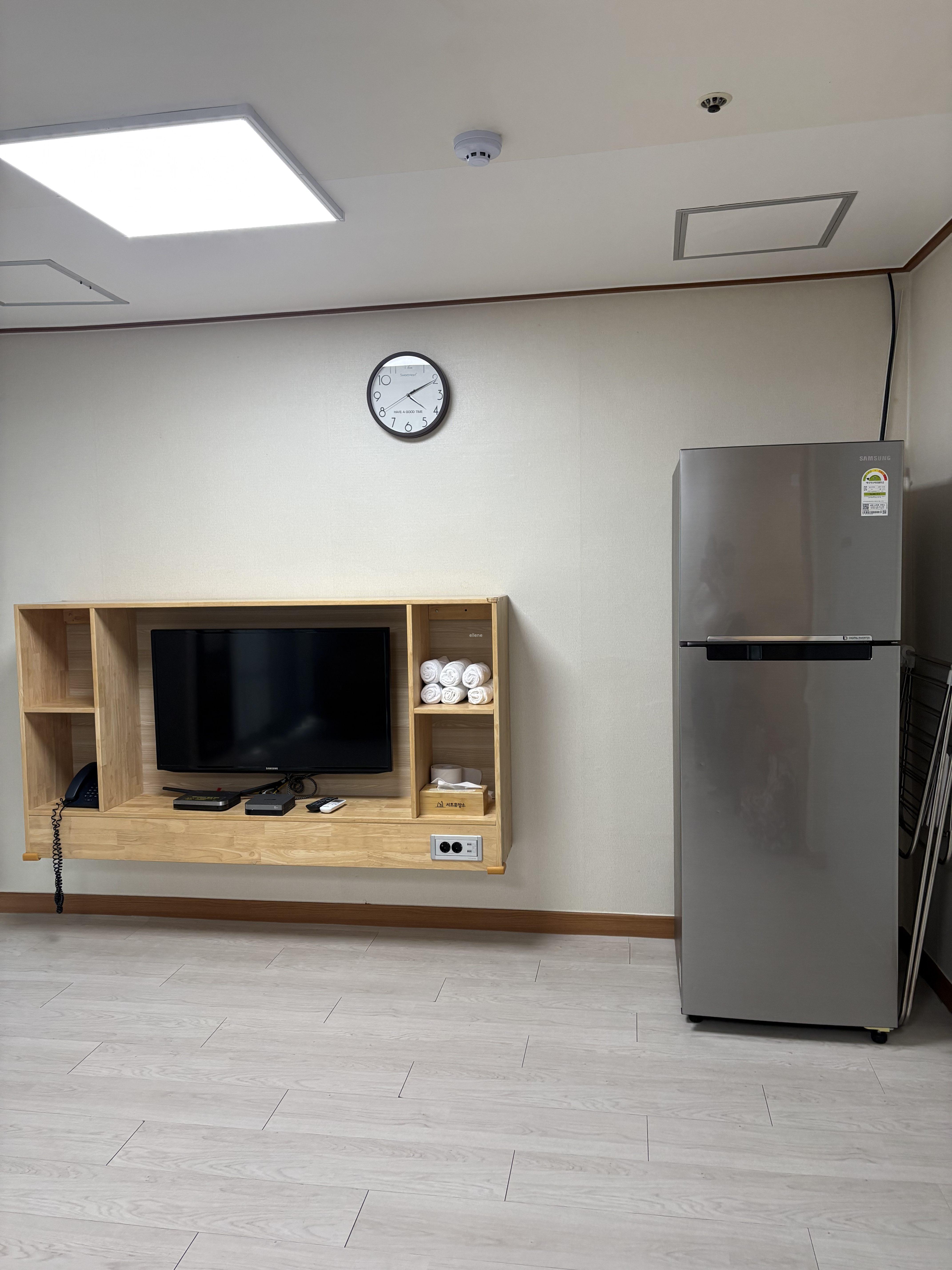 룸에 들어가자마자 가장 먼저 거실이 보였다. 쇼파, 쇼파테이블, TV, 냉장고가 넓은(?) 거실에 있다.