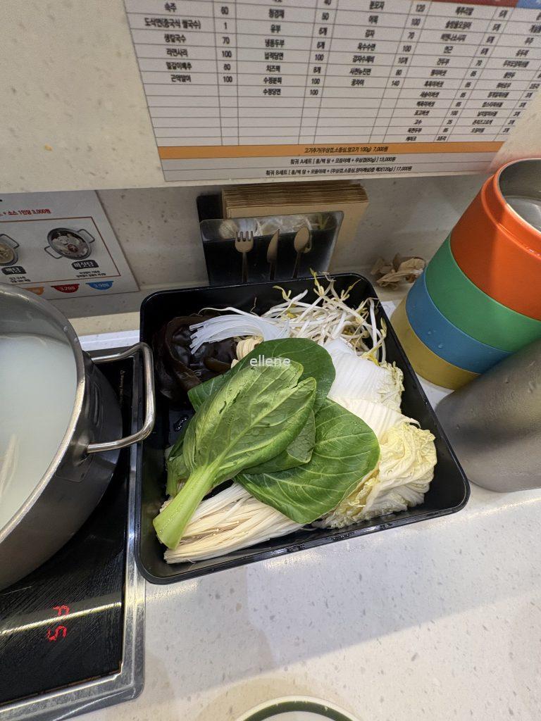 주문을 하자마자 자리에 탕과 모듬야채가 놓였다.