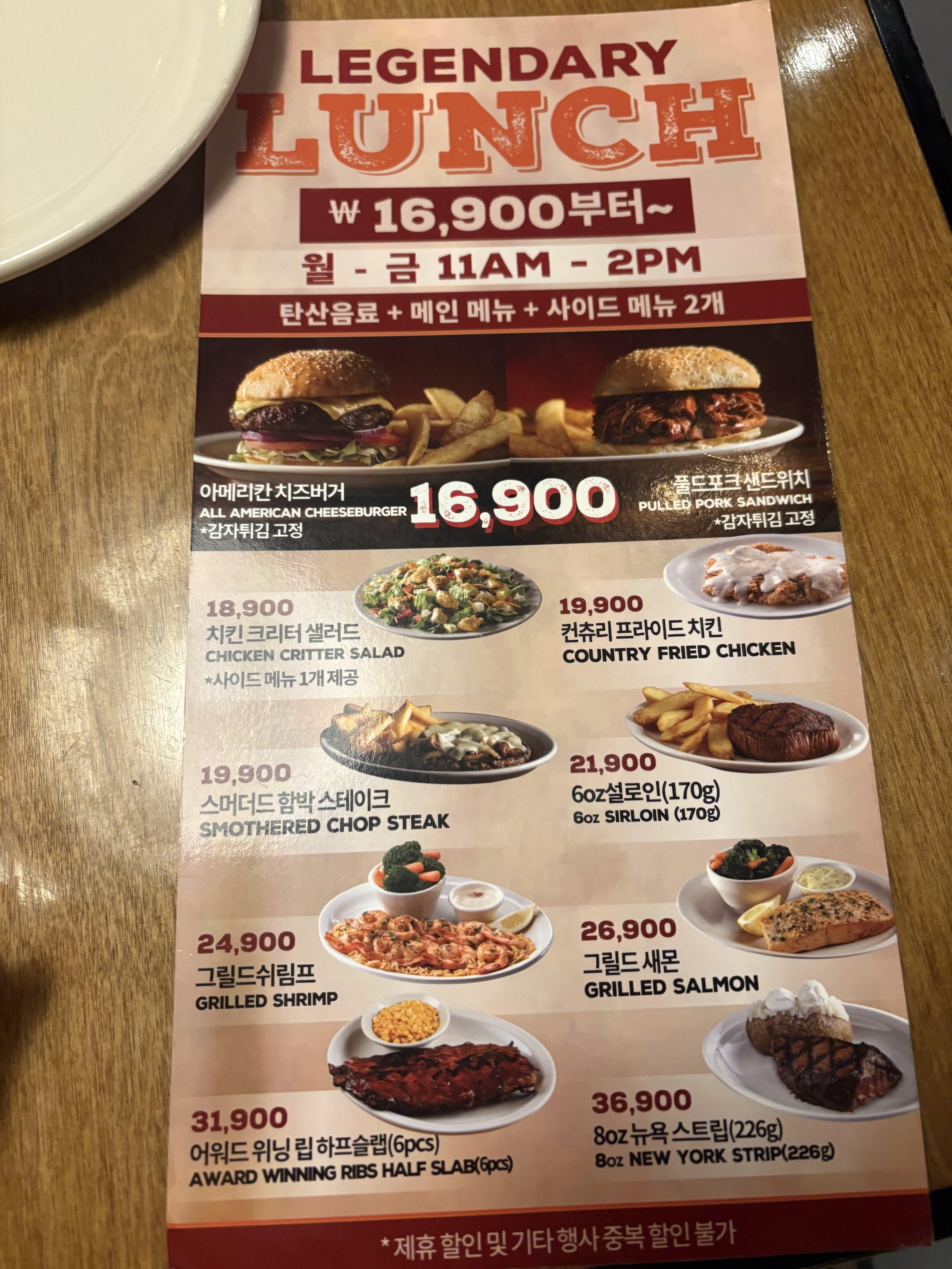 텍사스로드하우스의 런치세트는 구성이 꽤 괜찮아요. 메인메뉴 하나, 음료 하나, 사이드메뉴 두 개로 구성되어있거든요.