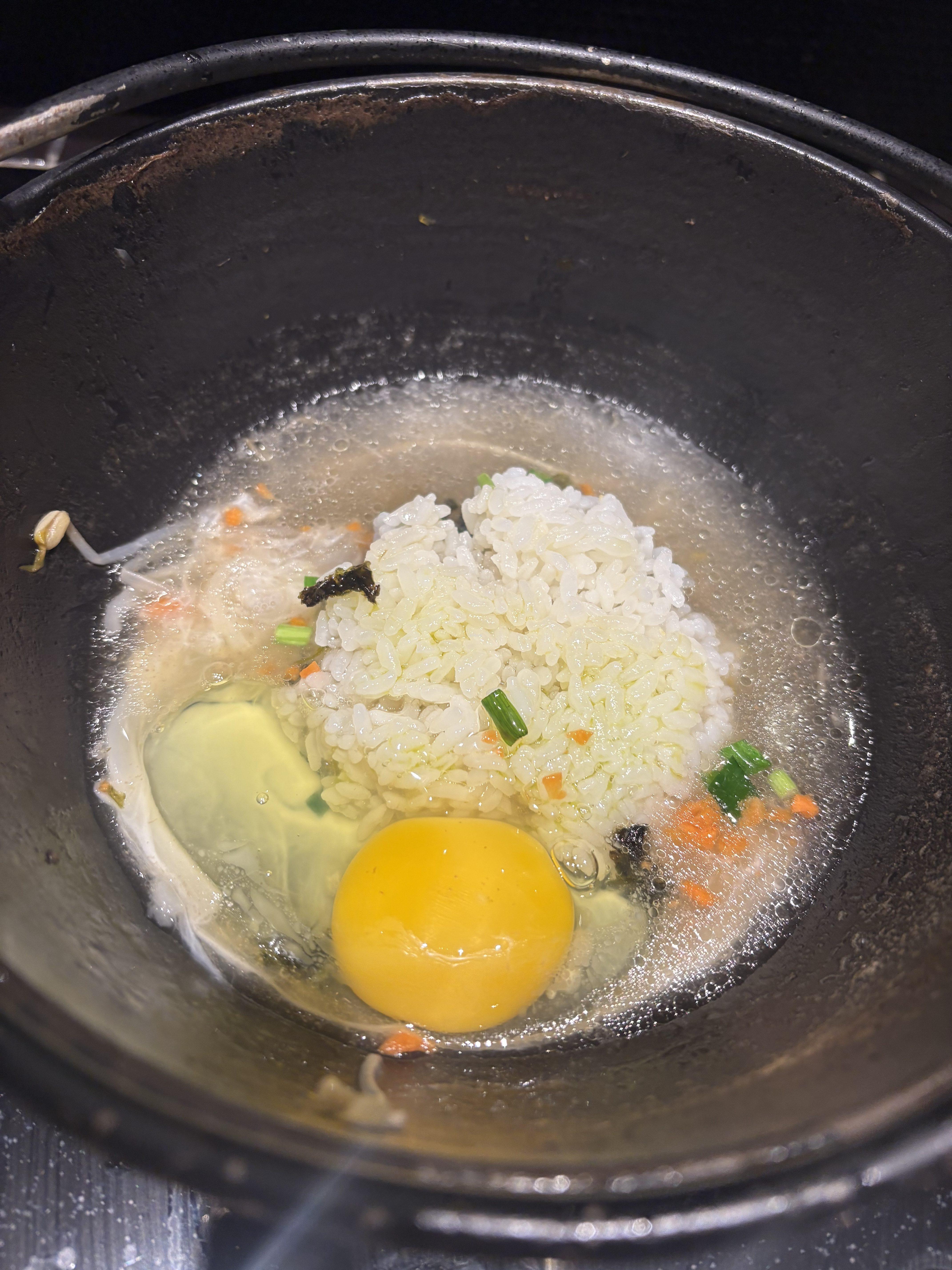 죽을 주문하면 직원이 달걀 하나와 밥+야채가 섞인 죽 재료를 주세요. 이 재료를 이용해 제가 직접 죽을 만들어먹어야 합니다.