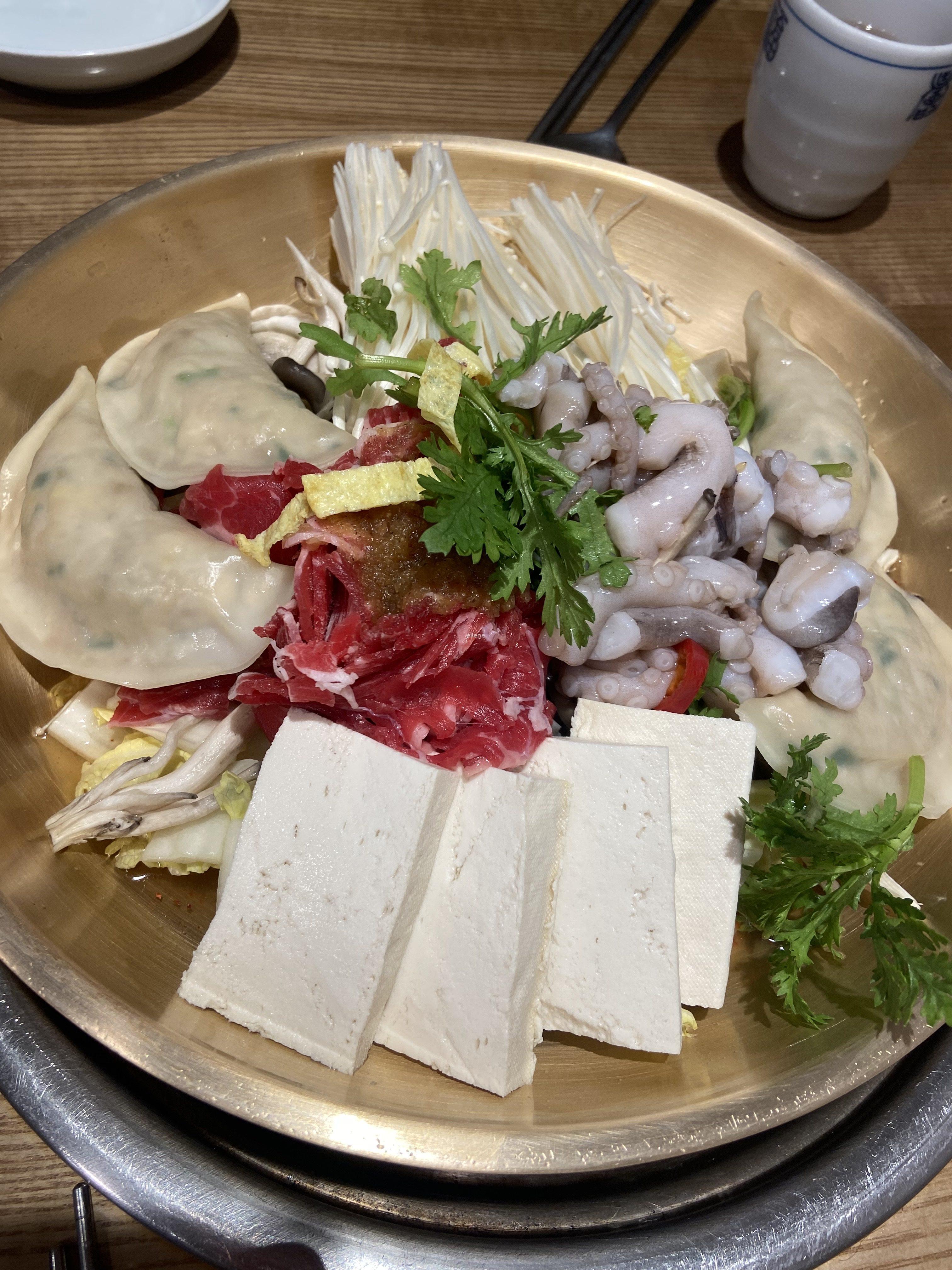 만두 전골의 진짜 비쥬얼. 커다란 냄비 안에 평양식 만두인 넓적만두와 함께 두부, 문어, 고기, 버섯 등이 들어있다.