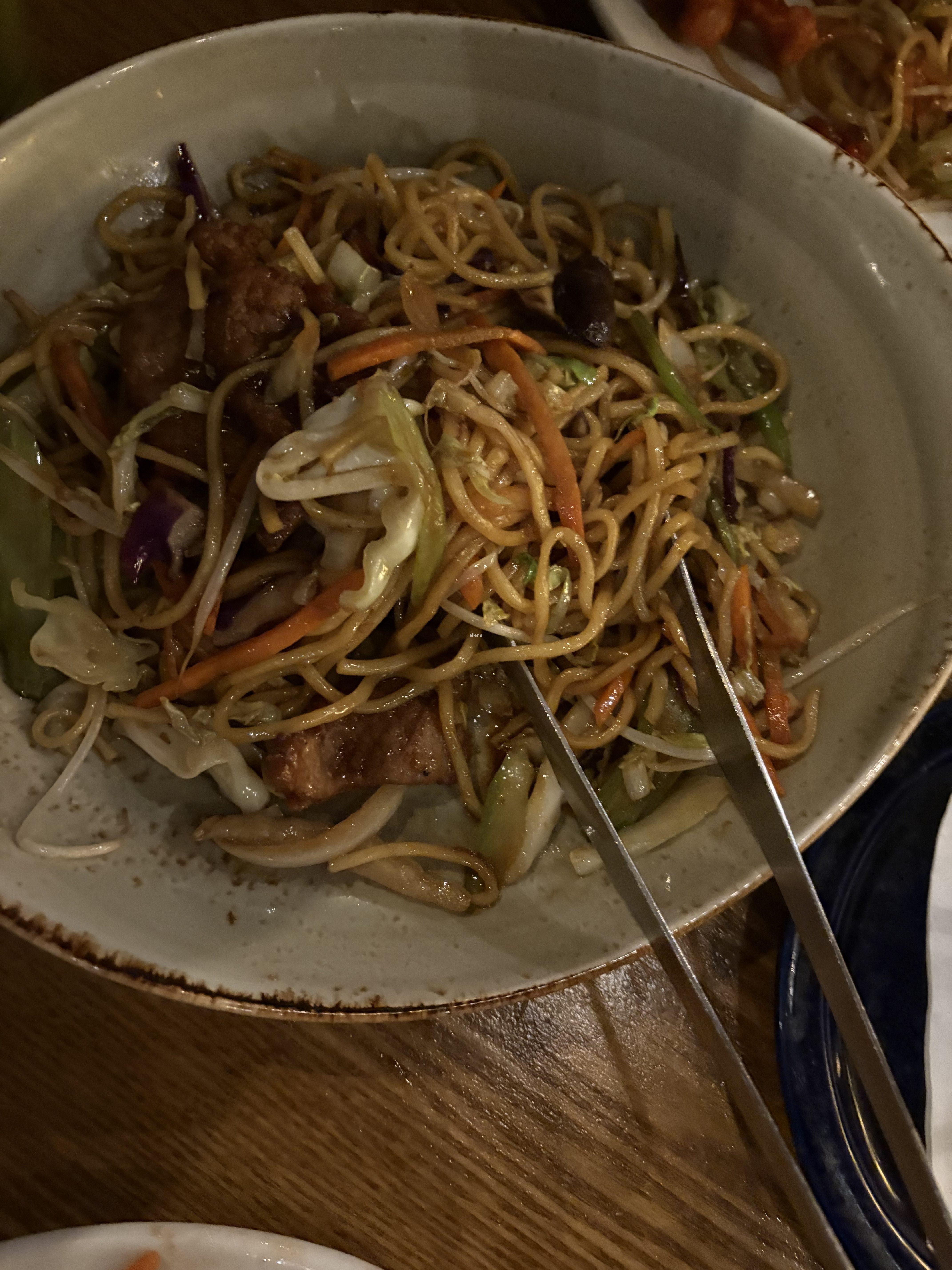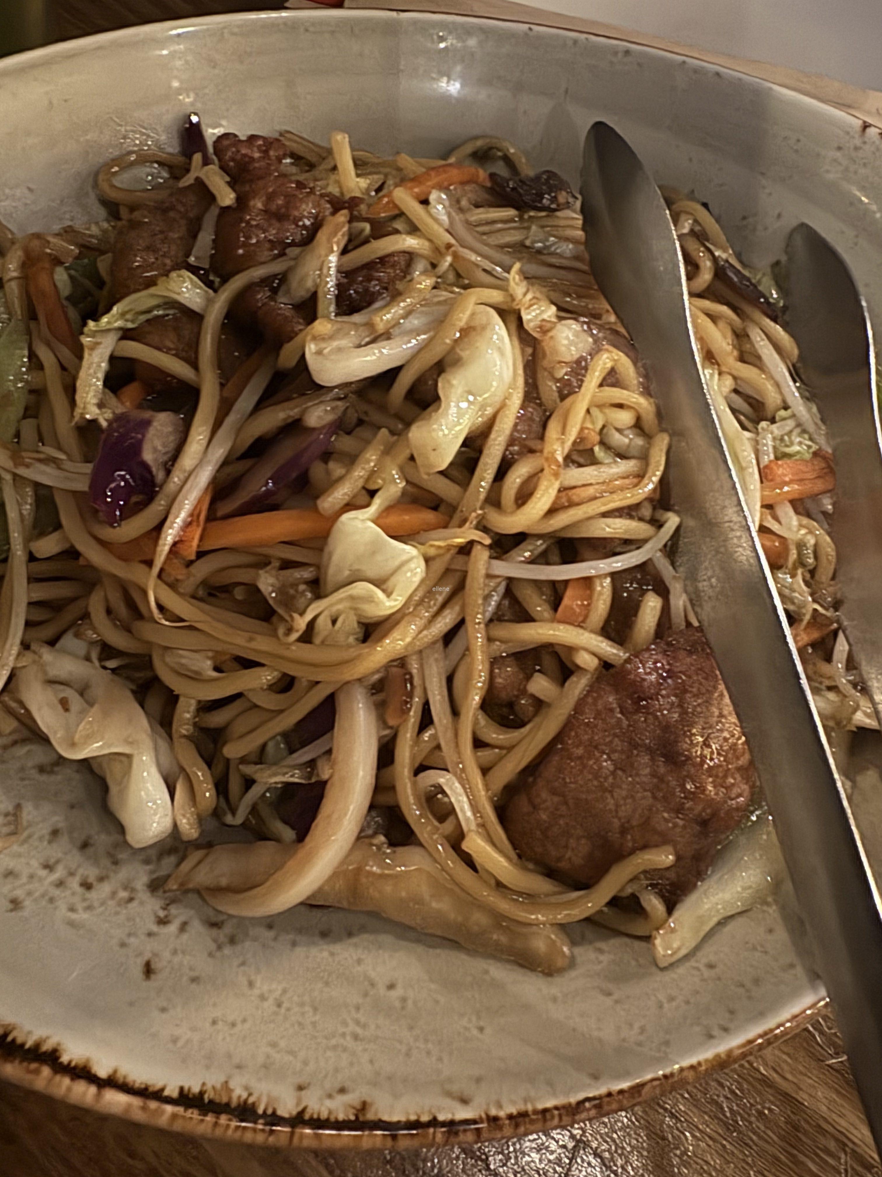 가장 먼저 제공된 것은 볶음면 요리였어요. 큰 접시 위에 간장 소스의 볶음면이 나옵니다.