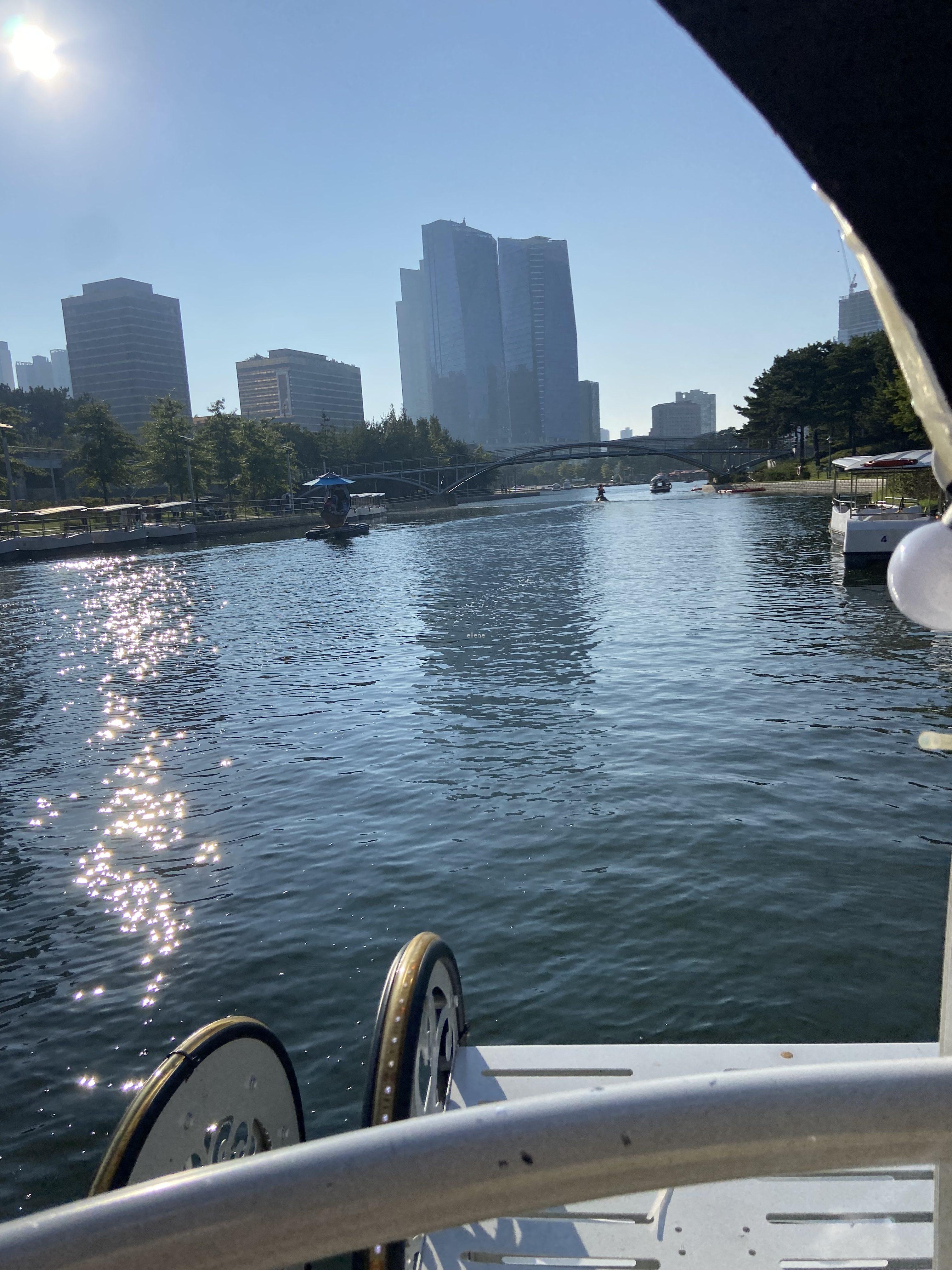 보트 너머로 보이는 송도 아웃라인. 물결도 반짝반짝해보이고 참 예쁘더라고요.
