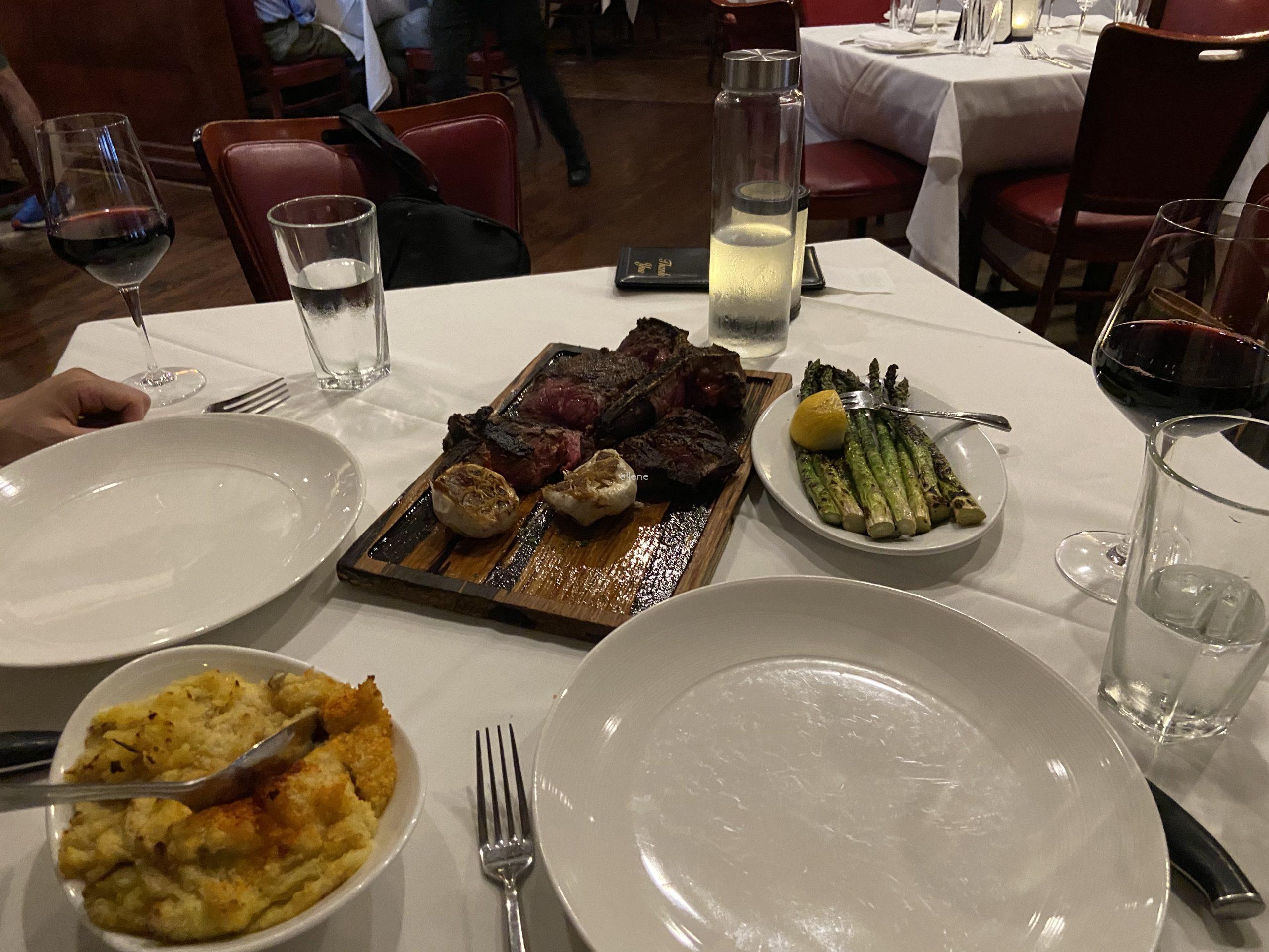 2명이 족히 먹을 포터하우스 스테이크, 아스파라거스, 매시포테이토, 와인 두 잔, 그리고 케이크.