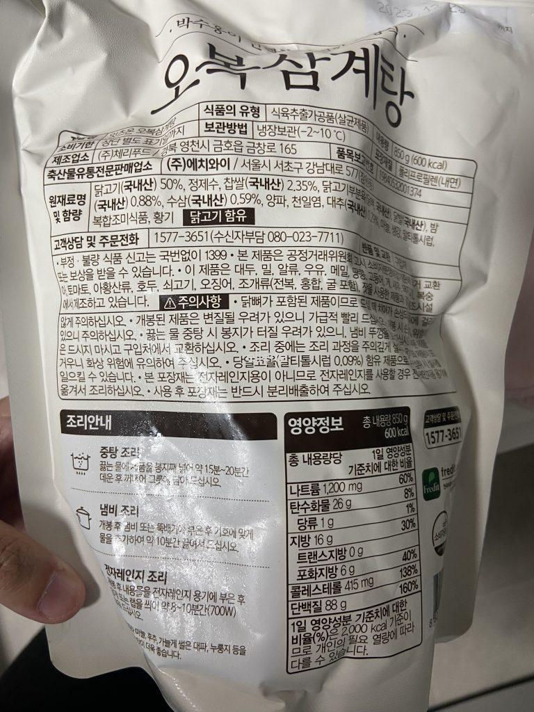 안에 닭 한 마리가 들어있어 그런지 삼계탕은 무게가 꽤 되고, 금액도 봉지 당 1만원으로 비싼 편이다. 그래도 좋은 닭과 재료로 만들려면 이 정도 가격과 무게는 되어야할 것 같다.