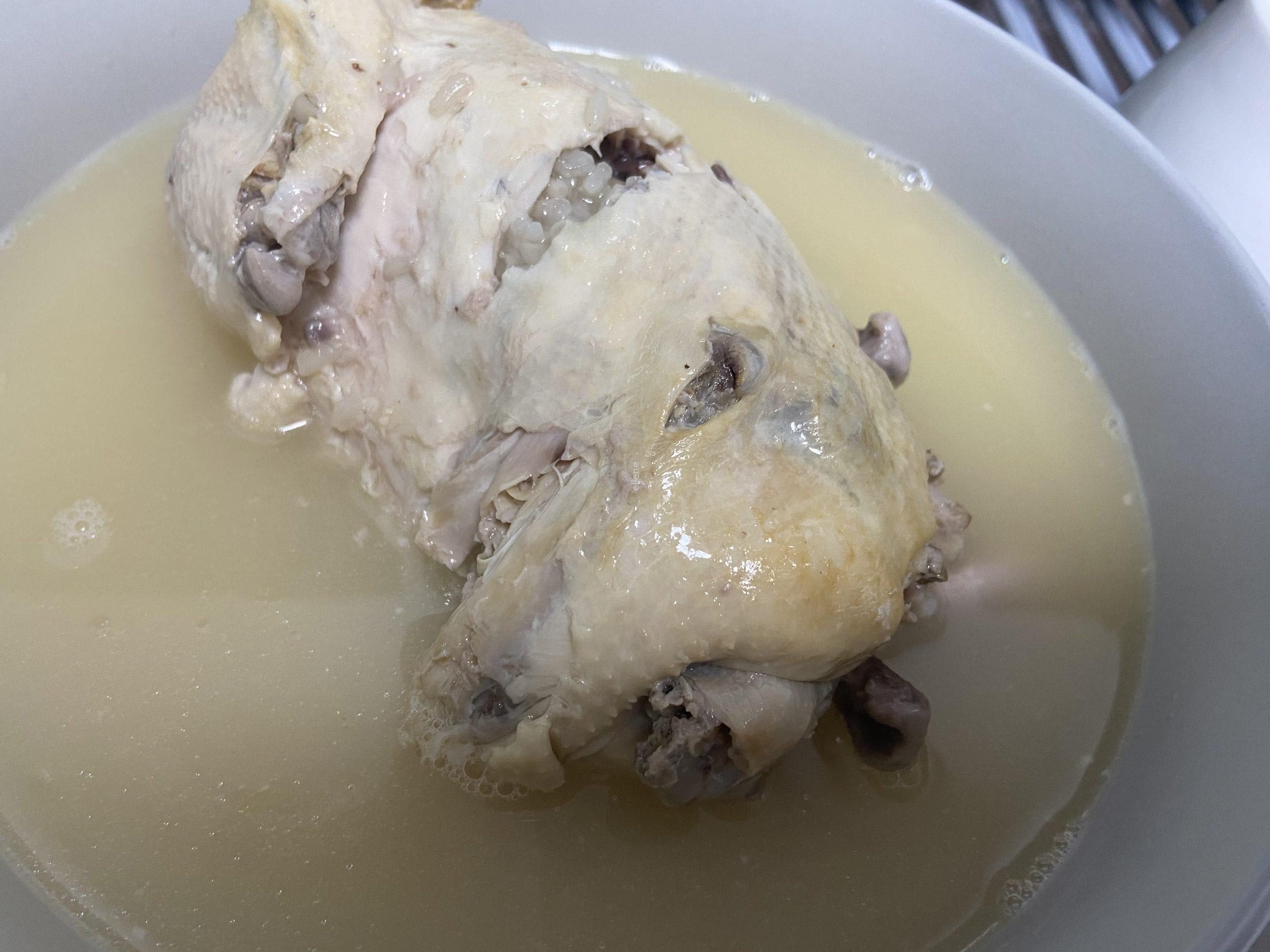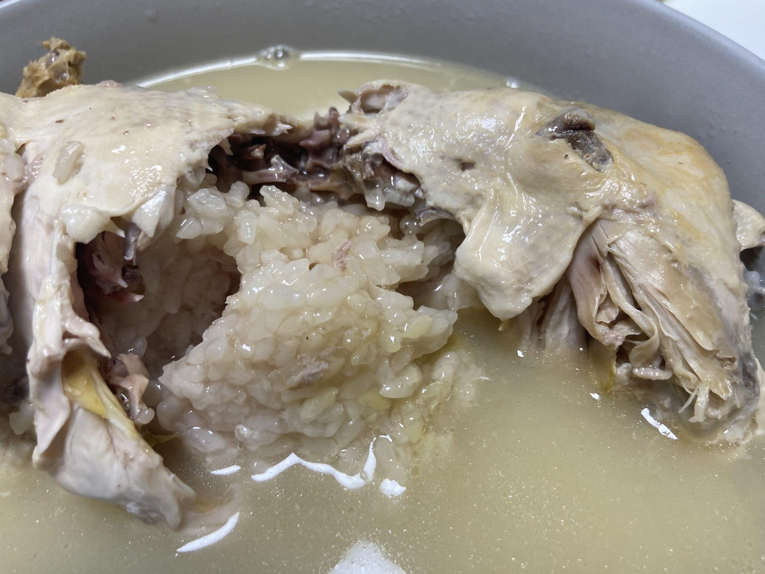 먹기 전에 내용물을 확인해보고 싶어서 젓가락으로 닭 안쪽을 열어봤다. 역시나 찹쌀로 만든 밥이 닭 안에 가득 들어있다!