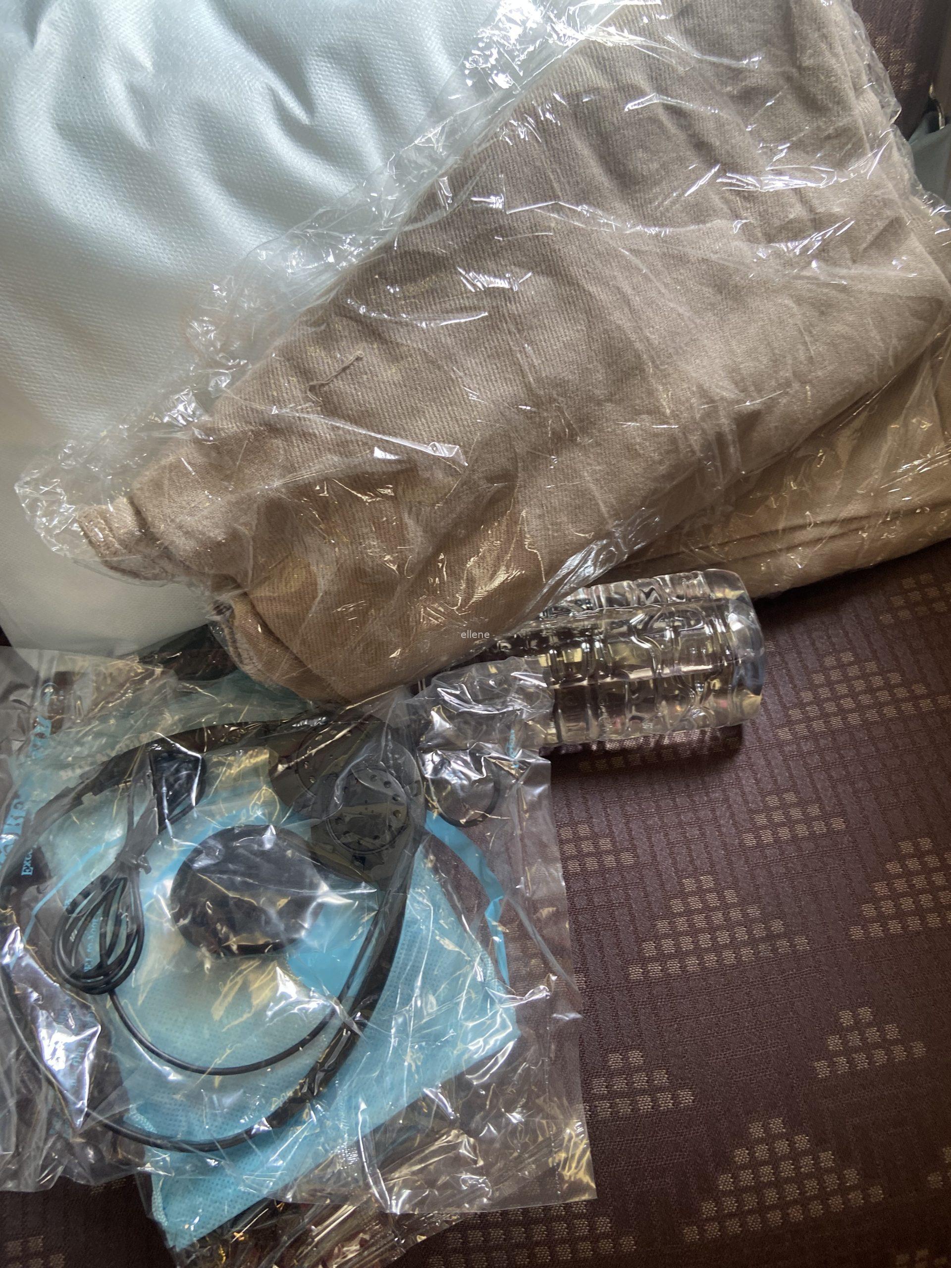 비행기 좌석에는 베개, 물, 담요, 이어폰, 그리고 세면도구가 들어있는 파우치가 있다.