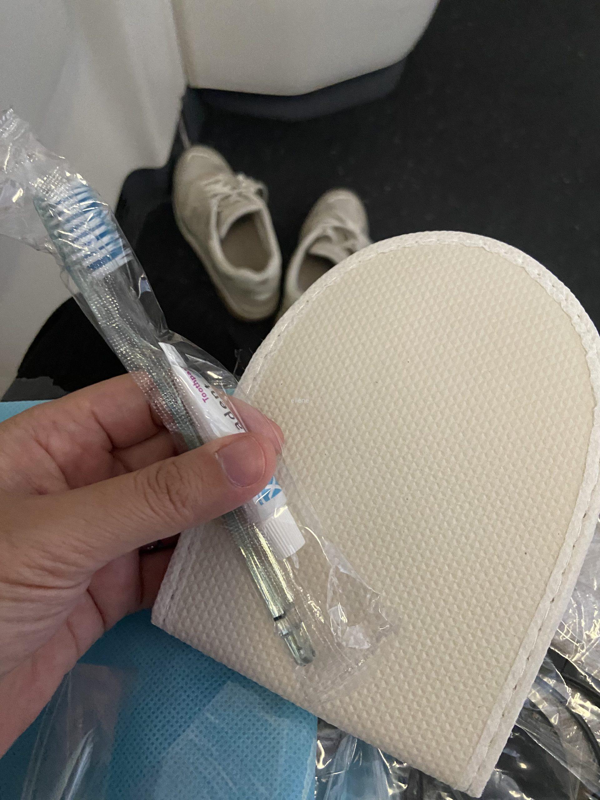 파우치 안에는 치약, 칫솔, 슬리퍼가 들어있다. 기내에서 화장실을 갈 때 매우 필요한 용품들이다.