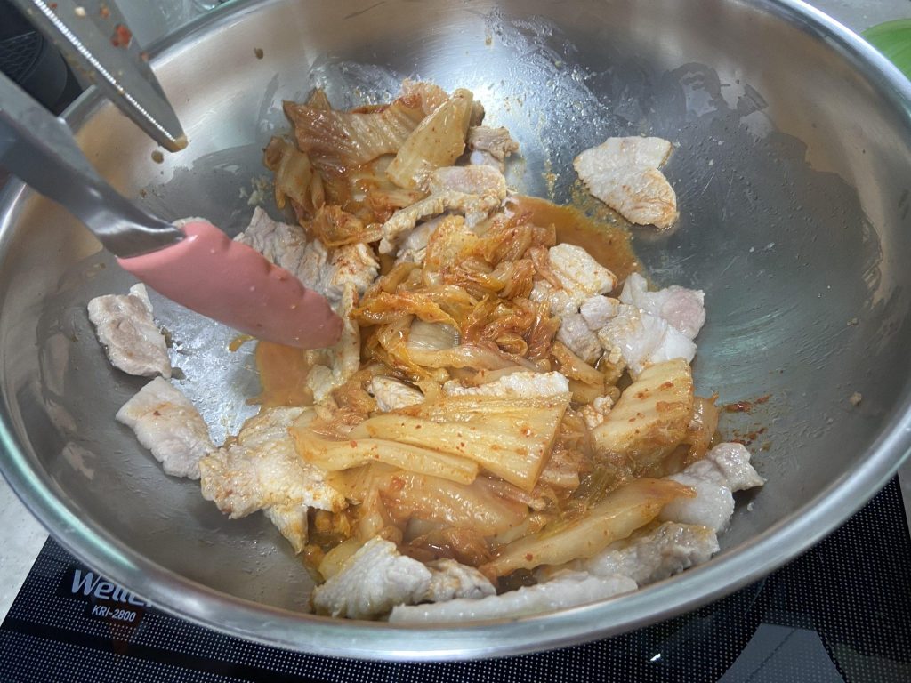 다음, 고기 크기로 자른 신김치를 반 포기 정도 넣고 같이 볶는다. 팬에 김치가 들어갈 때부터 집안엔 맛있는 향기가 진동한다.