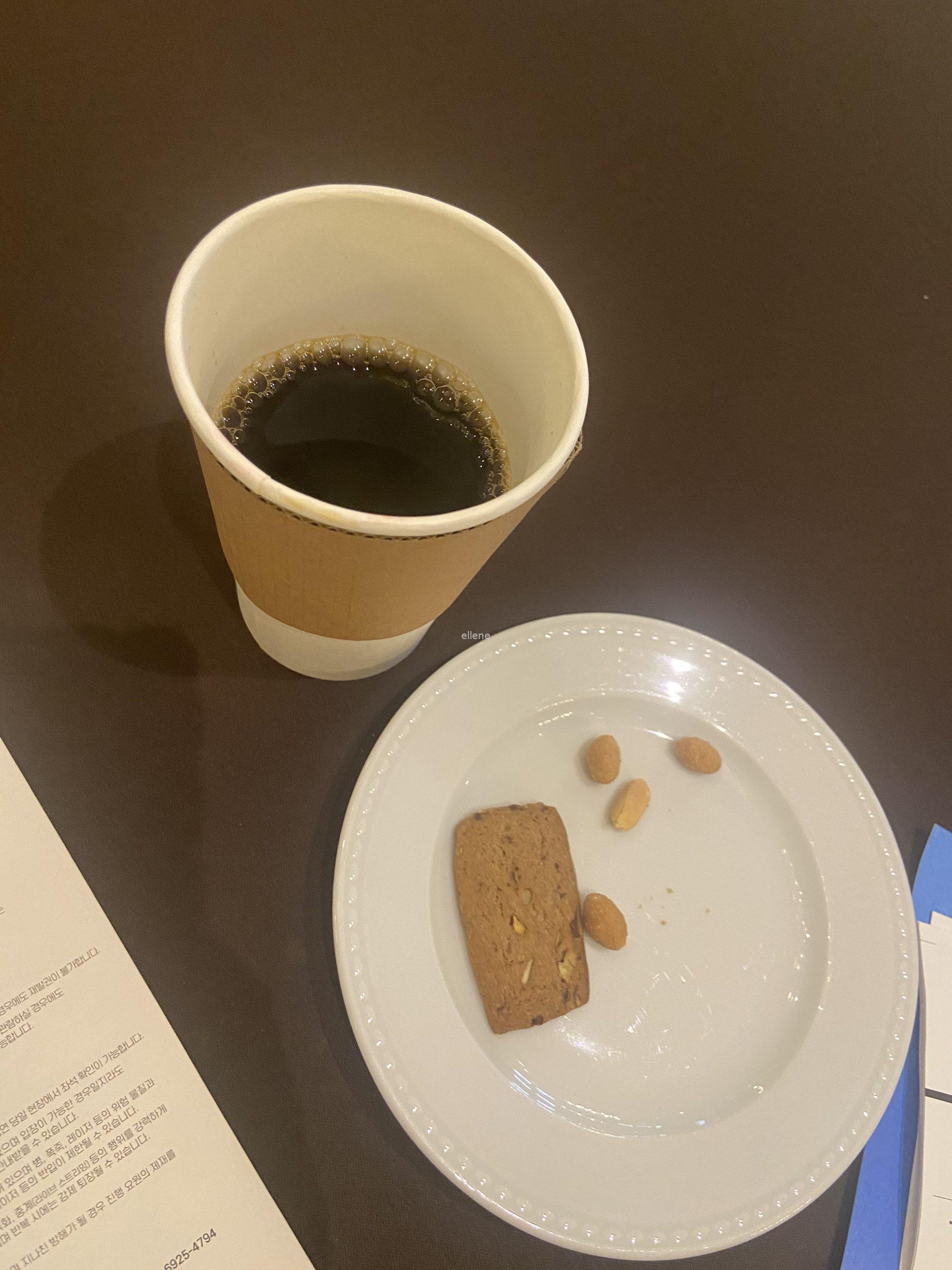 커피 종류는 한 가지. 따뜻한 드립 커피만 제공된다. 간단한 비스킷과 스낵류도 함께 먹을 수 있다.
