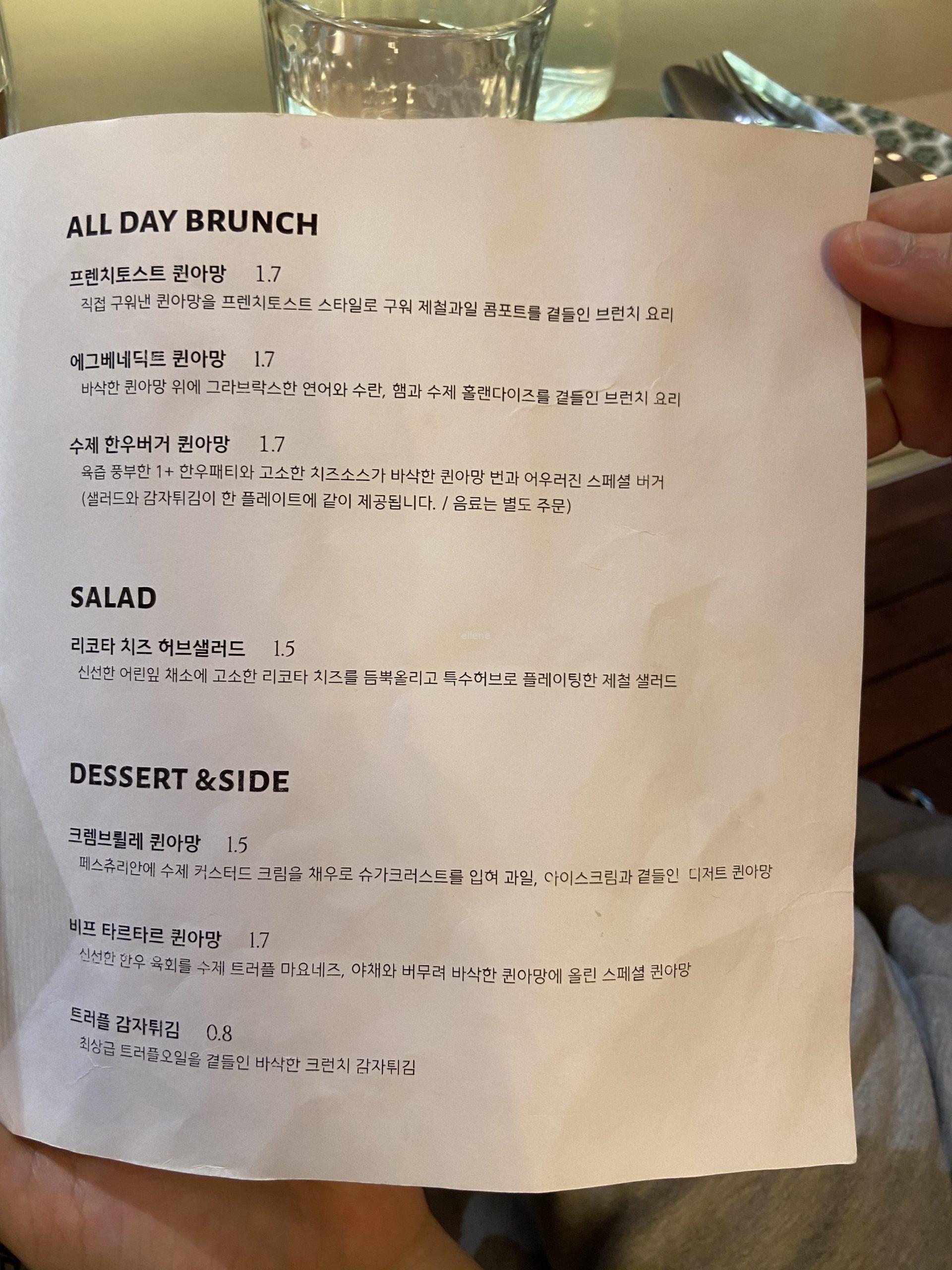 • 디저트&사이드: 크렘브륄레 퀸아망(1.5) / 비프 타르타르 퀸아망(1.7) / 트러플 감자튀김(0.8)