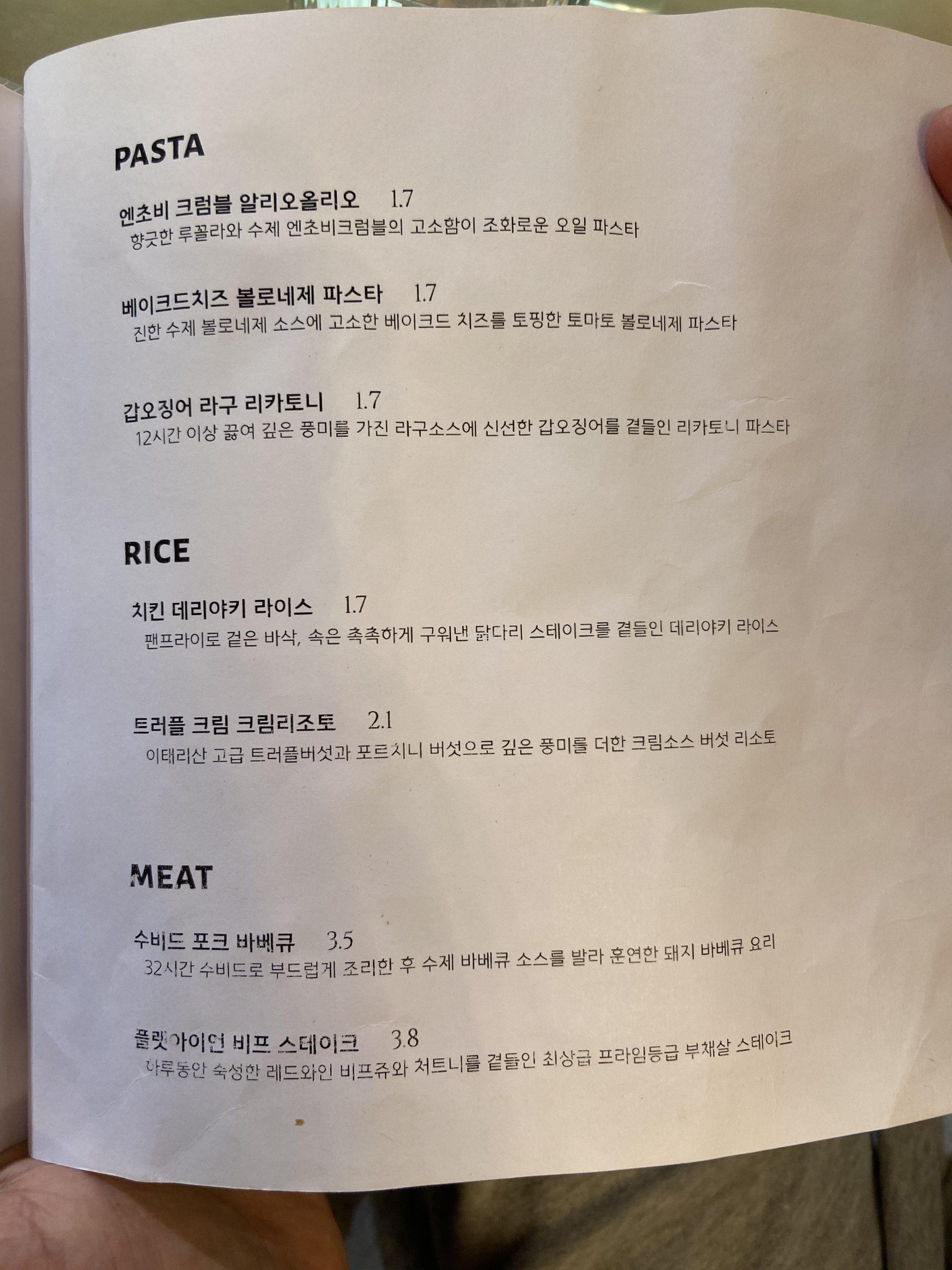 • 파스타: 엔초비 크럼블 알리오올리오(1.7) / 베이크드치즈 볼로네제 파스타(1.7) / 갑오징어 라구 리카토니(1.7)