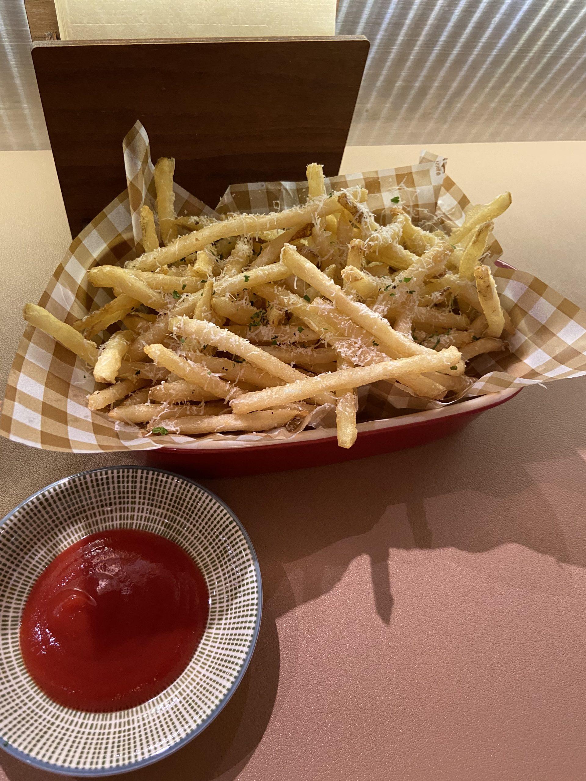 우리는 에그 베네딕트, 알리오올리오, 그리고 트러플 감자튀김을 주문했다.